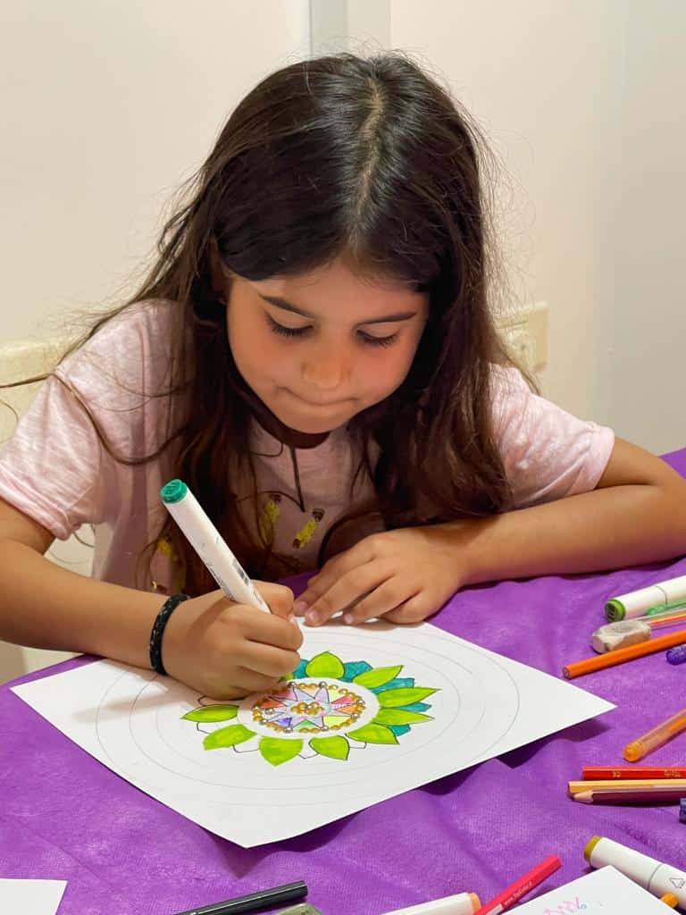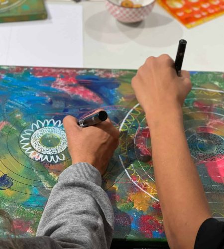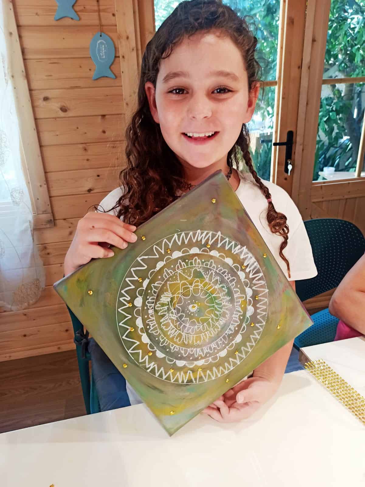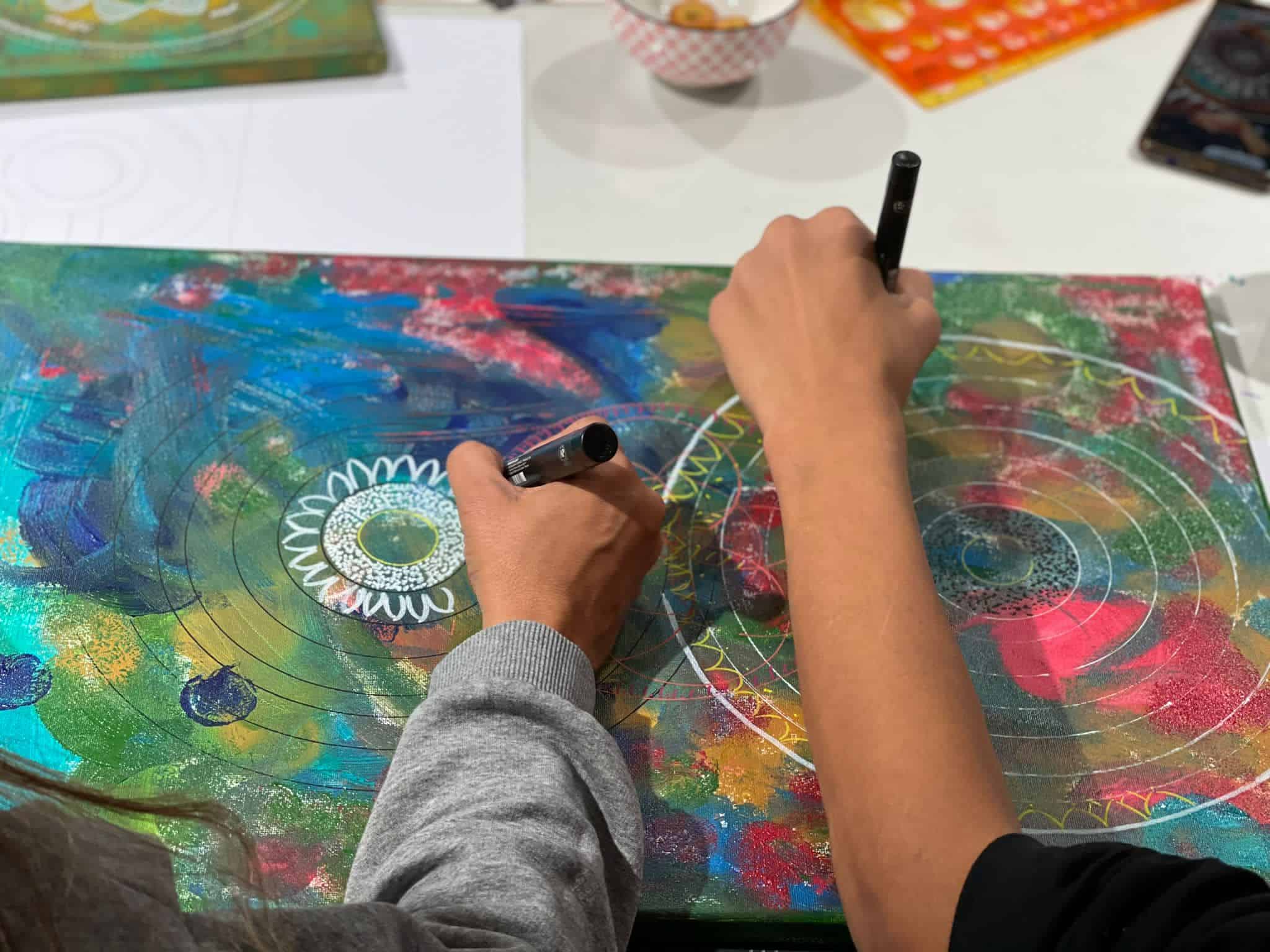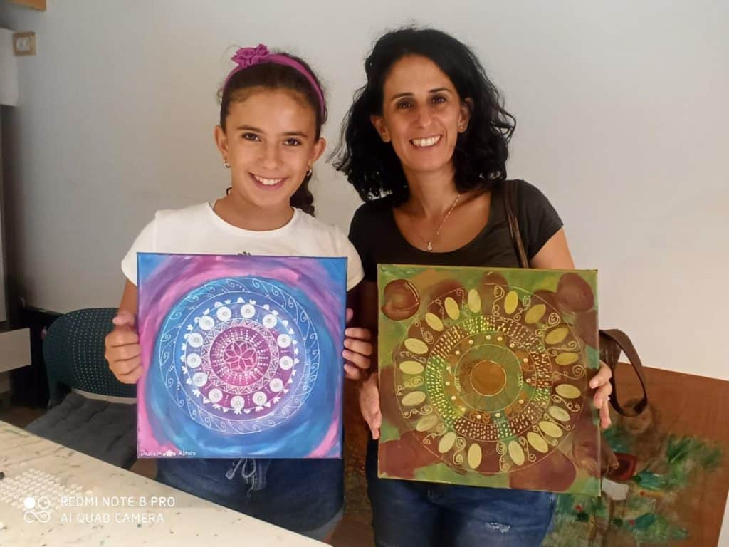 אנחנו מציירות על הקנבס, בוחרות צבעים, מתייעצות, עוזרות אחת לשנייה בחשיבה היצירתית בשרטוט המנדלה.